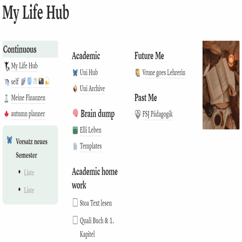Meine allgemeine Übersicht auf Notion siehst du auf dem Bild hier drunter. Sie ist in grobe Lebensbereiche eingeteilt und inspiriert von Jade Bowler, vor allem bekannt unter ihrem handle Unjaded Jade. Sie ist YouTuberin und Authorin von dem wunderbaren Buch „The Only Study Guide You´ll Ever Need„. Darin gibt sie viele hilfreiche Tipps um organisiert und entspannt zu lernen und in Klausurenphasen zu starten und diese zu „überleben.